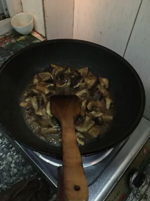加入适量红烧酱油和醋,继续翻炒此时锅内有汤汁,我个人认为香菇应该弄熟的久点会健康安全,爆炒仍然3分钟