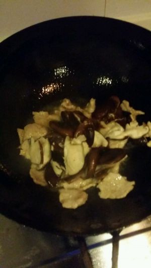 依次加入牛肉、香菇、青菜,翻炒2分钟左右,炒出香味