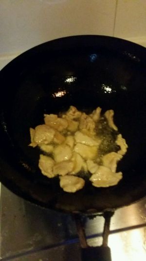 再起锅热油,放入抓好的肉,煸至颜色变白。