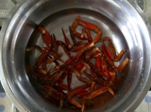 不要以为刚才就炒好了,好戏还在后头呢!捞出虾后,倒出大部分油,留一小点在锅里,然后把腌虾用的姜啊,蒜什么的放进去炒,然后加入油辣椒,炒出香味之后就可以放虾继续炒