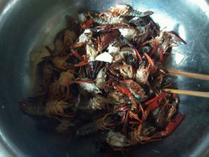 加入腌制好的虾子,注:腌制出的水不要倒入锅中,因为这些水比较腥会影响菜的味道