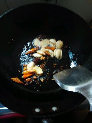 锅中加油,放入切好的蒜瓣,洋葱,尖椒爆香