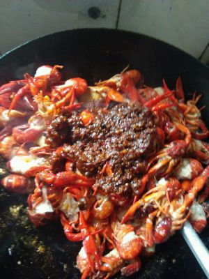 待虾子炒至变成亮红色,加入一大勺辣酱,一大勺豆瓣酱,迅速翻炒拌匀。