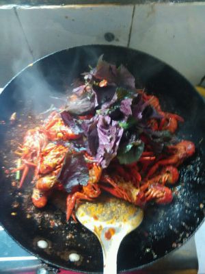 翻炒酱料均匀后,加少许水,继续翻炒这样可以使酱料包裹很均匀,呆汤汁收至自己喜欢的粘稠度,关火放入紫苏翻炒几下便可。