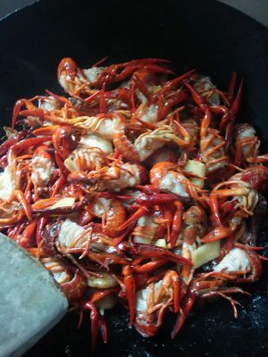 小龙虾腌制好后,炒锅烧热,倒入油约100毫升,小火加热,放入姜片、蒜、花椒、辣椒等调料煸香。