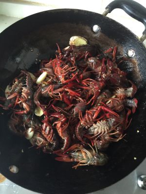 加入干辣椒 姜片 花椒 小龙虾进行翻炒后加入一罐500ml的啤酒 以及少量白酒 白糖