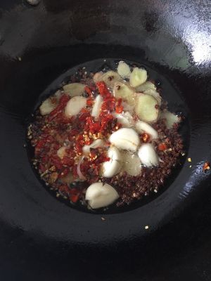 将花椒,生姜,八角,大蒜,辣椒按顺序放入7成热的油锅中,油比平时炒菜的量多一些。