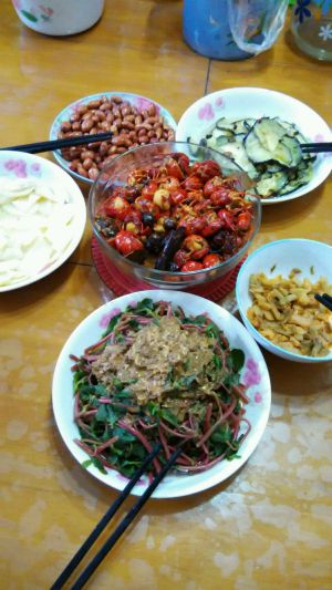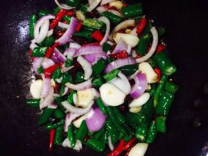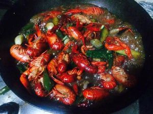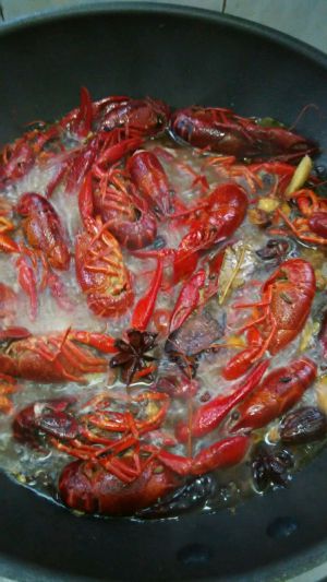 热油,加入辣椒、洋葱、大蒜翻炒。香味出来之后加入一点老抽、和醋。然后放小龙虾翻炒。