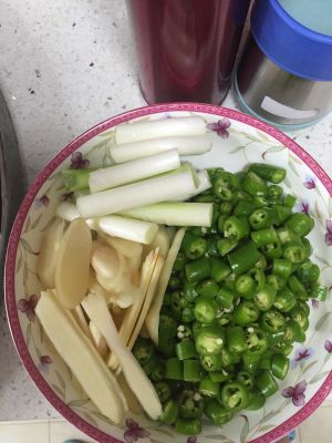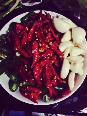青辣椒、红辣椒、干辣椒、大蒜备好。