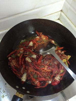 放花椒、老姜、香叶炒香后放龙虾爆炒,适量放点料酒和醋