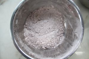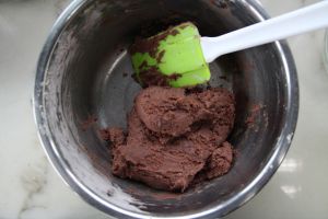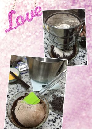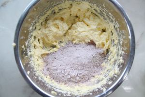 面粉和泡打粉混合后过筛,加入巧克力糊,翻拌均匀。