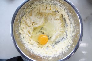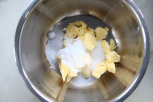 黄油室温软化后加入细砂糖跟糖粉用电动打蛋器打发至轻盈的羽毛状,颜色发浅
