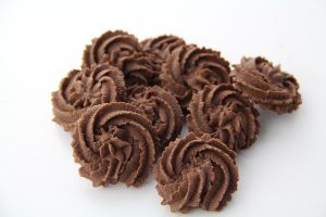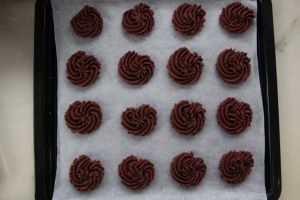 牛奶加糖粉低温融化,黄油微化打发,加入凉好的牛奶拌匀,再加入面粉、可可粉、盐,拌匀后用曲奇枪挤花