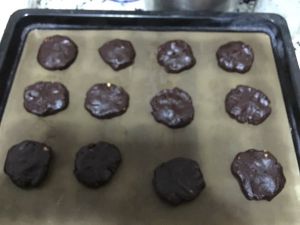 烤箱170度预热,烤盘铺上油纸。将面团用勺子舀起,在手上捏成均匀大小的圆形(或者倒在烤盘上用勺子调整形状),饼干之间保持两厘米距离。