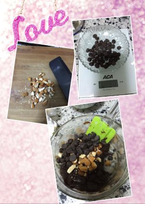 巴旦木切碎和剩下的30克巧克力豆加入面糊里搅拌均匀。