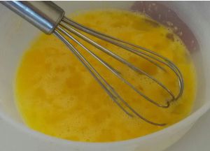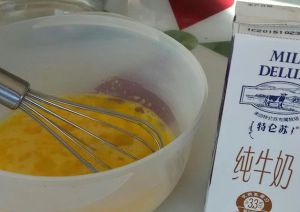 准备蛋挞液,一个鸡蛋打入碗中,加入80克牛奶拌均,将蛋挞液舀入刚刚压好的红薯小碗里,8分满就好
