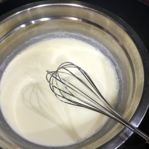 蛋奶液:奶油+牛奶+糖放盘,整盘隔着热水把奶液搅匀;