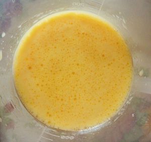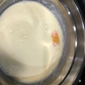 奶液暖和时放入蛋黄,搅匀;