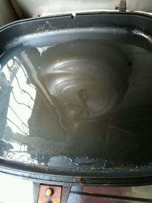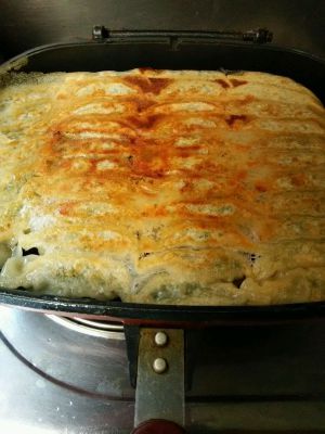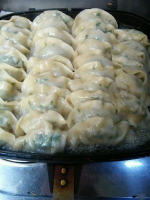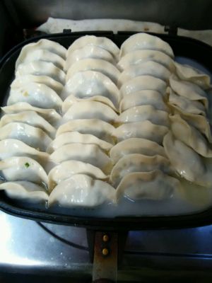 开始煎制,把火烧开稍稍热一下,把面粉水均匀地倒进锅中,以能没到馅的三分之二就行了,不可过多,也不能太少