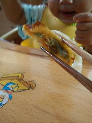 等的有点心急吧,全程需要几分钟,慢慢的面粉水里的水蒸发掉了,出现了好看的冰花孔洞,看看图片上的冰花部分是不是有点白,说明里面还有水,这样还不行,等着都变成金黄色就可以了,轻轻碰一下饺子,饺子轻松和锅子分离,慢慢取出饺子,就成功了