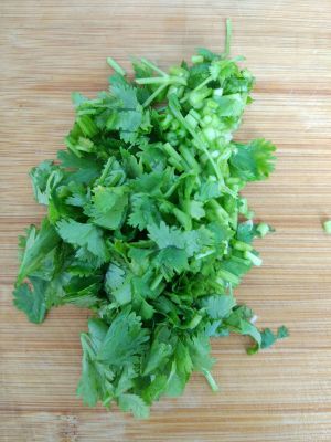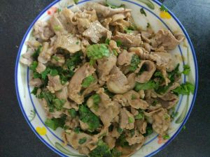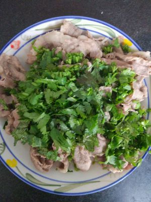 羊肉放在沸水里,煮熟变色,立即捞出,和香菜一起放盘。