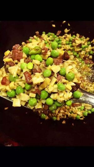 洗净的糯米 豌豆 笋干等下锅中火翻炒