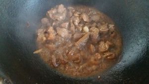 一分钟后打开锅盖,不停翻炒至锅内汤汁收干,撒入盐少许,孜然粒,不停翻炒,此时要拿锅当铁板用,快速翻炒。
