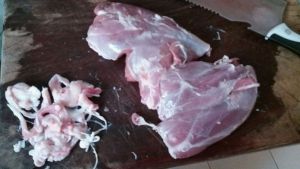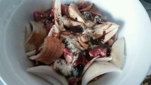 切丁,放洋葱,胡椒粉,料酒两勺,生抽少许,耗油两勺。