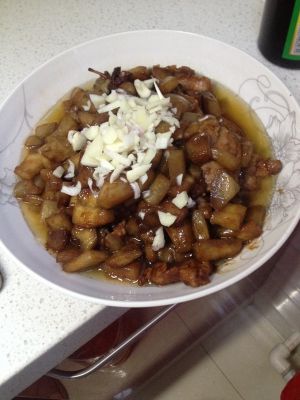 锅里放入油下入炒好的牛肉,把料汁放入,立刻放入茄子,收汤,关火。盛盘子放入蒜末,ok美味大功告成