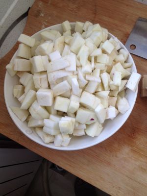 茄子切丁,热锅放油,放入一颗八角,出香味放入茄子,炒透