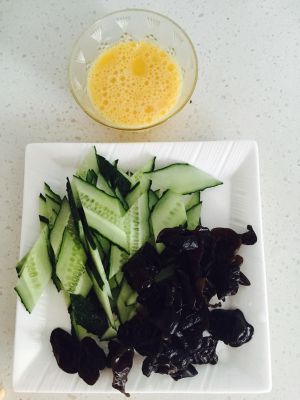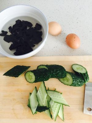 黄瓜切片,木耳用热水泡开,热水泡的快,凉水或者温水都可以的。