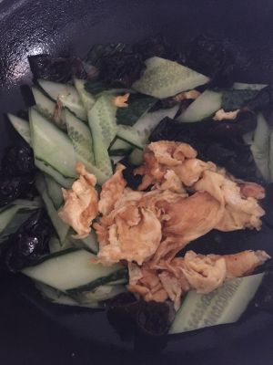 把鸡蛋盛出来,在起锅放油,加入葱花爆香之后放入黄瓜片和木耳,在放入鸡蛋,加入盐,生抽,醋,淀粉水。出锅时放点鸡精调味。