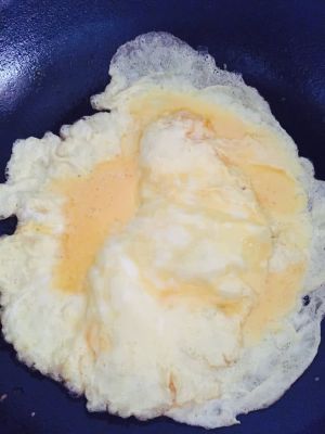 锅里油烧热后倒入鸡蛋,油热一点炒出来的鸡蛋才会更好哦!
