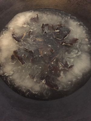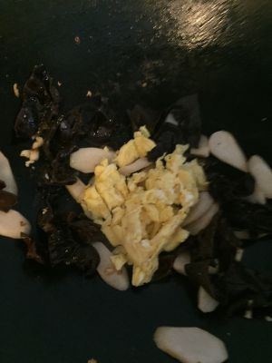 在放木耳,我这木耳用开水烫过,不用炒时间太长