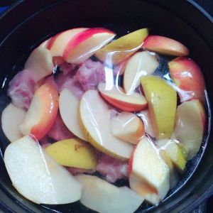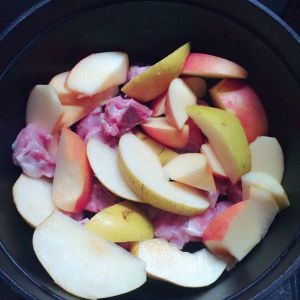 锅洗净,放入洗干净的排骨,苹果和雪梨,我用的是法琅铁锅,煮汤很快的,汤特别浓原汁原味。