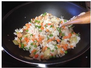 4炒锅倒油倒入香菇,胡萝卜翻炒片刻。 5.放香肠翻炒。加玉米、豌豆、熟米饭继续翻炒 6.加适量盐,再放入菠萝 7.淋入香油,加少许鸡精翻炒均匀即可