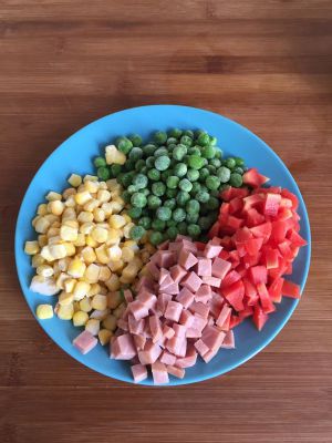 香肠,胡萝卜切丁,玉米粒 豌豆粒煮熟备用