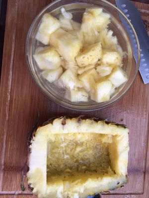 从菠萝的1/5处切开,留下的做容器,轻轻地将菠萝果肉挖出,并用淡盐水浸泡15分钟后切成小丁备用。