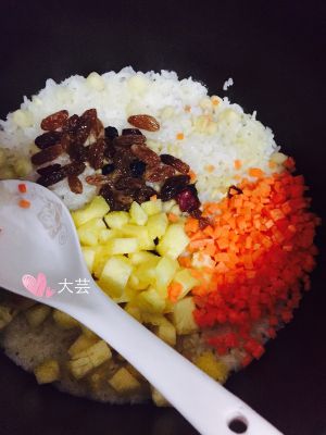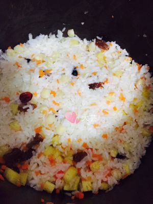 高压过蒸好可以提前放汽打开。蒸好米后加入葡萄干,胡萝卜粒➕菠萝粒搅拌均匀…