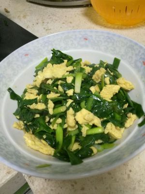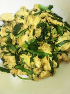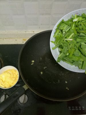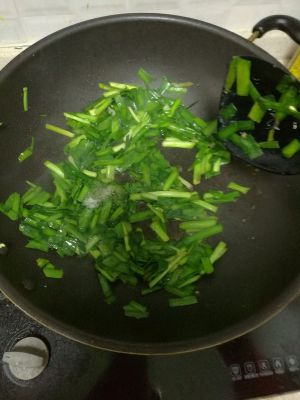 锅中少油,鸡蛋炒熟,盛出备用 锅中少油,倒入韭菜,加入少许盐,鸡精,翻炒均匀