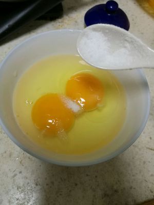 炒至韭菜变色,加入鸡蛋,撒少许盐翻炒均匀即可,我只顾拍照,炒的有点过了