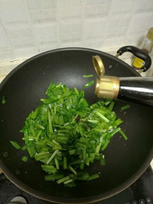 韭菜加糖,盐,翻炒出水,加炒好的鸡蛋