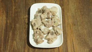 肉飞水:和清水一起放进去,等水沸后,表面会浮起很多血沫。将排骨捞起,置流动的水下冲洗干净,再沥去多余水分备用