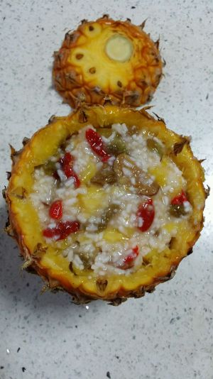 等米饭的水熬干,下冰糖,菠萝丁,继续加少许水,待电饭煲跳到保温即可。