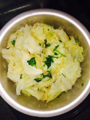 焯好的包菜放入盆内,撒上食盐,香菜末
