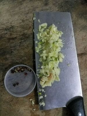 放油加热,放入咸猪肉炸出油,加热一定程度,将大蒜和包菜一起放入锅中爆炒,放入适量的生抽,不断翻炒。快熟后放入盐,味精即可