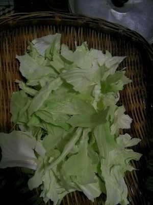 圆白菜私下叶片后,用清水 少许盐浸泡洗净后捞出控干,撕成片备用。