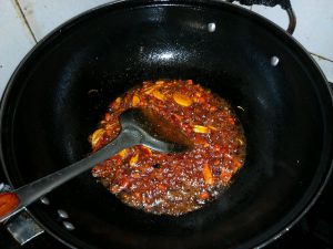 翻炒出香味后倒入1-2勺豆瓣酱炒出红油。
