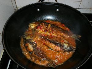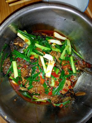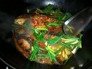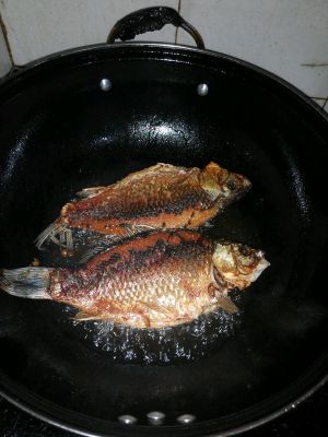 热锅下油,把另一半姜丝和蒜片煽炒到变色,下鱼炸到两面变金黄,加入3勺酱油,少许鸡精,再加没过鱼身的水,水开后中火再烧3分钟左右就可以起锅了(喜欢吃辣的可以放干辣椒更香)