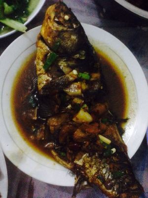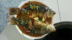 汁子留在锅中,放入青椒,葱,大火煮2分钟,倒入醋,加淀粉水大火收汁,浇于鲫鱼身上。